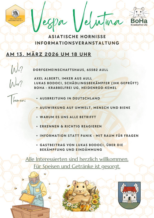 Unsere Nachbargemeinde Aull lädt am 13. März 2026 um 18 Uhr ins Dorfgemeinschaftshaus zu einer Informationsveranstaltung zur Asiatischen Hornisse ein.