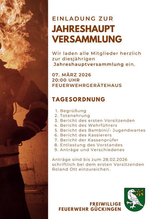 Hiermit laden wir alle Mitglieder herzlich zur diesjährigen Jahreshauptversammlung der Freiwilligen Feuerwehr Gückingen ein.