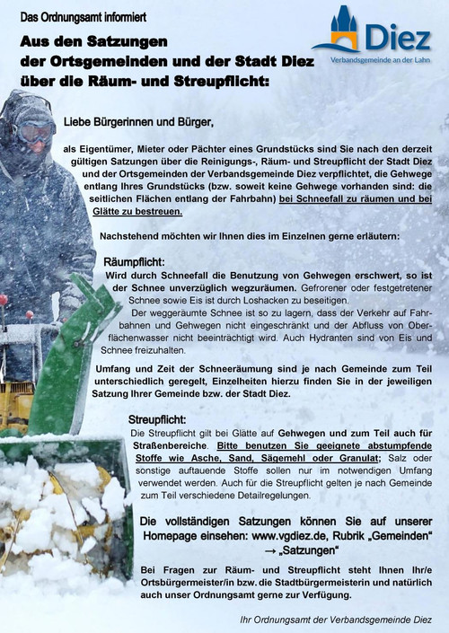 Umfang und Zeiten der Räum- und Streupflicht richten sich nach unserer Gemeindesatzung.