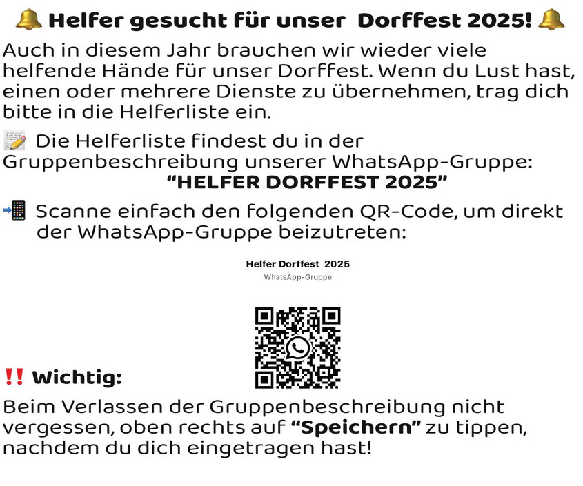 Für unser Dorffest 2025 suchen wir motivierte Helfer, die ein oder mehrere Dienste übernehmen möchten. Trag dich einfach in die Helferliste ein, die du in unserer WhatsApp-Gruppe „Helfer Dorffest 2025“ findest. Scanne den QR-Code und werde Teil unseres Teams!